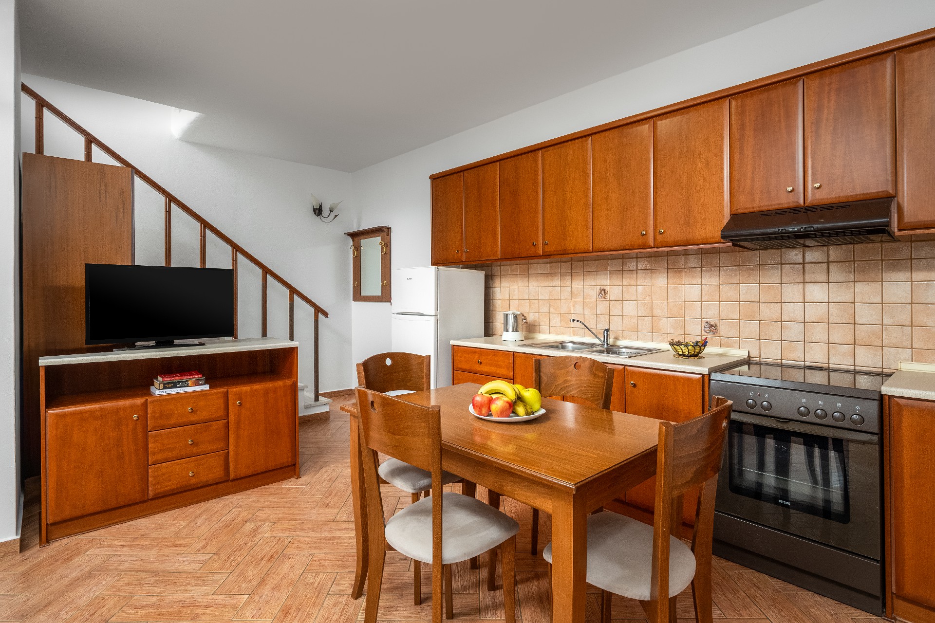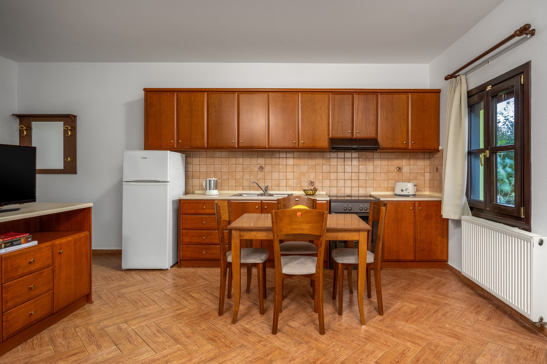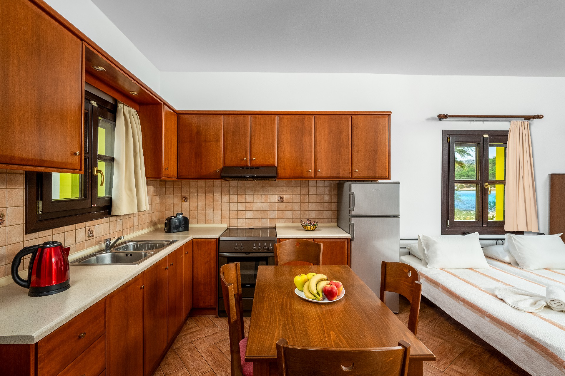 Όλες οι κουζίνες παρέχουν πλήρη οικιακό εξοπλισμό. Επιπλέον παρέχουμε, εάν χρειαστείτε, πιστολάκι μαλλιών, σίδερο ρούχων και πλυντήριο ρούχων. Επίσης, κατά τη διάρκεια της διαμονής σας παρέχουμε και υπηρεσία καθαριότητας.