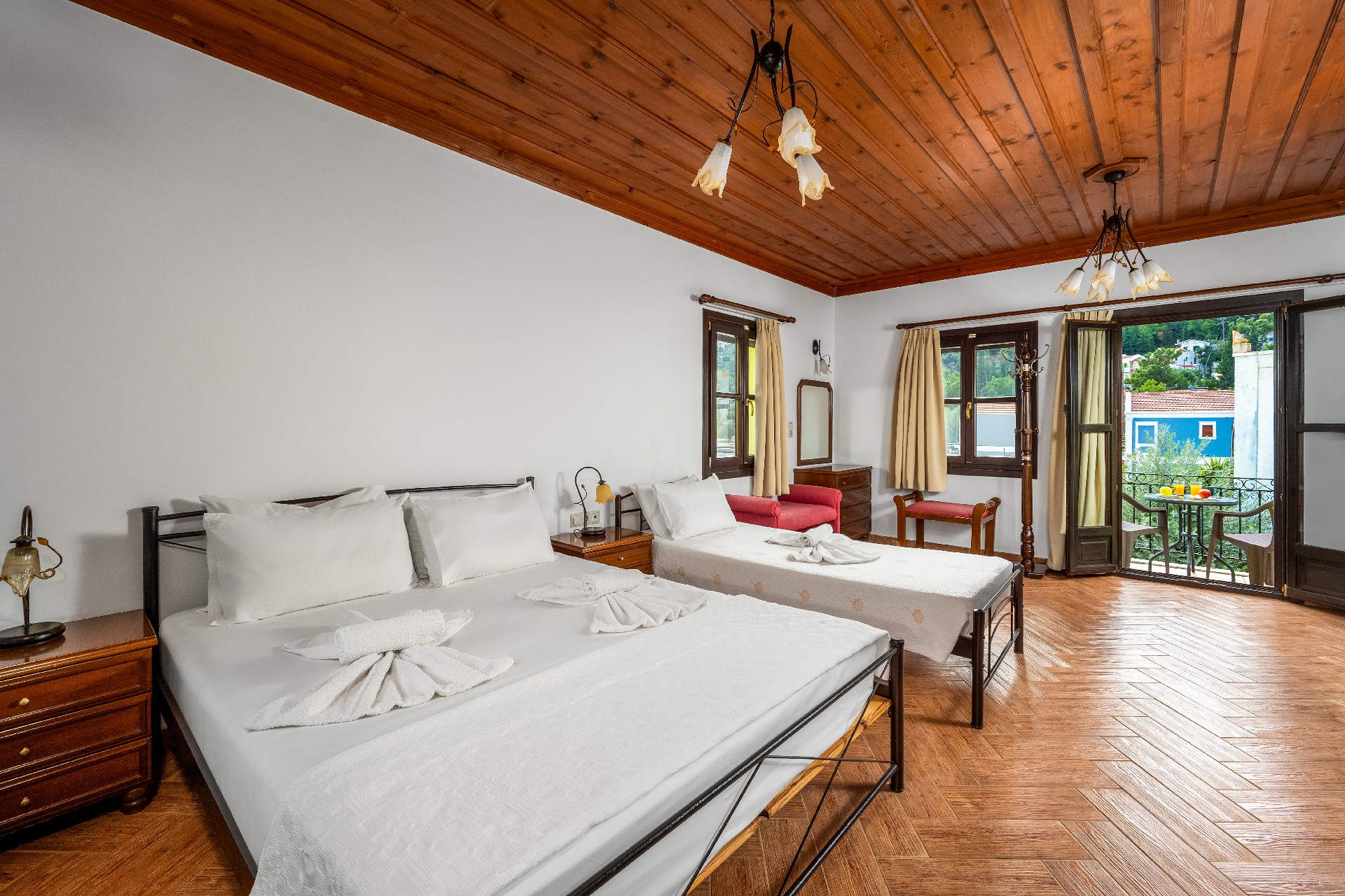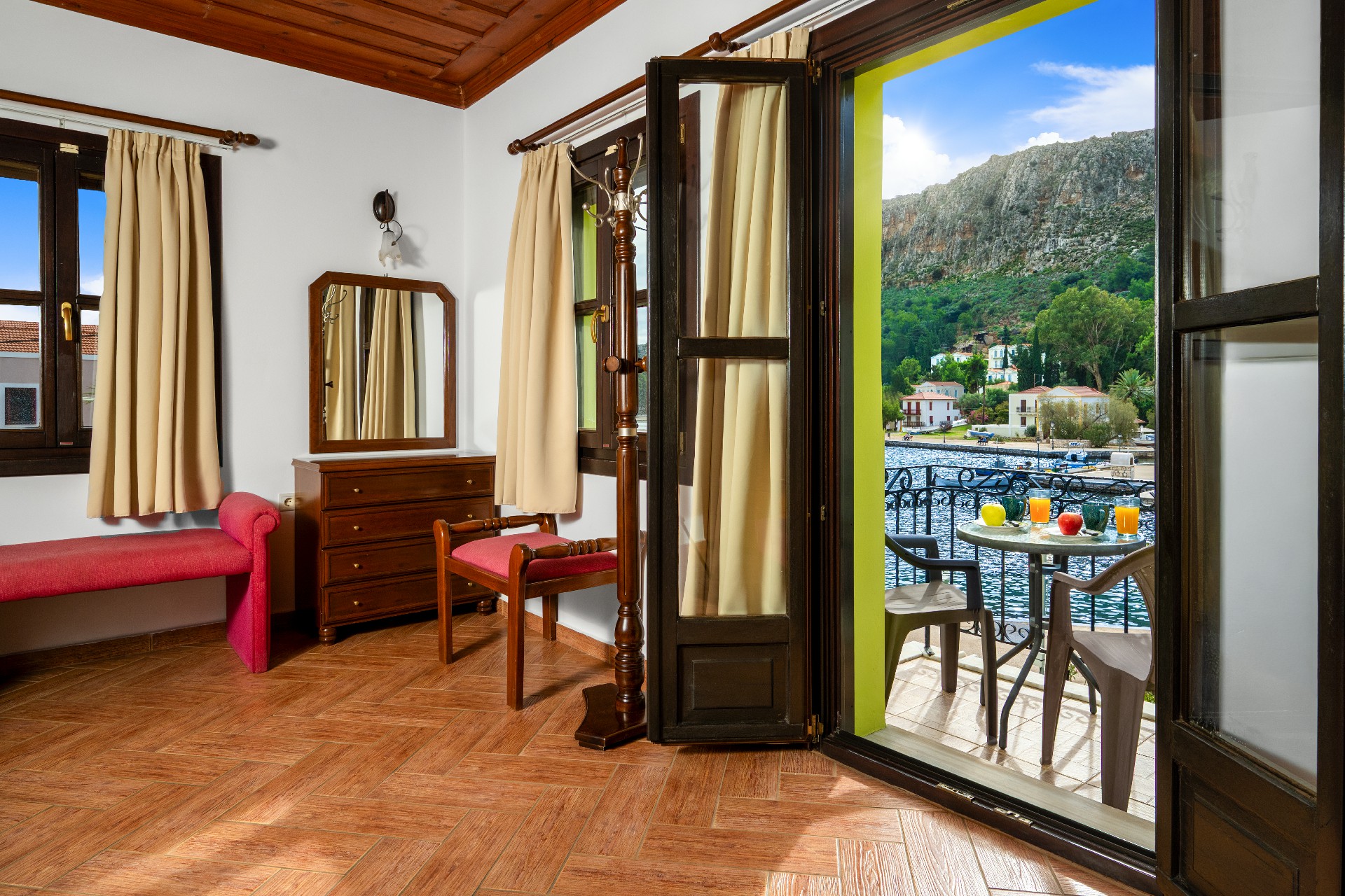 Τα δωμάτιά μας διαθέτουν μπαλκόνια με μαγευτική θέα στο γραφικό μικρό λιμανάκι (Μαντράκι) εξασφαλίζοντάς σας υπέροχη θέα μοναδική για ξεκούραση και ηρεμία. Επίσης, μπορείτε να πιείτε τον καφέ σας και να απολαύσετε το απέραντο γαλάζιο θάλασσας και ουρανού στις μεγάλες αυλές μας, κάτω από την παχιά σκιά που παρέχουν οι μεγάλες ομπρέλες που βρίσκονται εκεί.