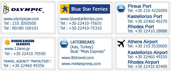 Για περισσότερες πληροφορίες και ακριβή δρομολόγια συμβουλευτείτε: Olympic Airways Αθήνα: +30 210 966-6666 Ρόδος: +30 22410-24571, 24551, 83400 (αεροδρόμιο) Καστελλόριζο: +30 22460-49250